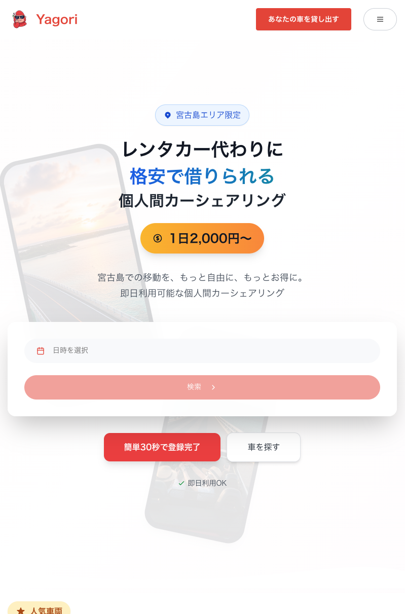 「Yagori」は、個人間のカーシェアリングで車両維持費の負担を軽くするサービスです。空いている時間をシェアして、賢く、楽しく、車を所有し続ける。オーナーにも、借りる人にも、そしてお財布にも優しい新しい移動の形を提案します。